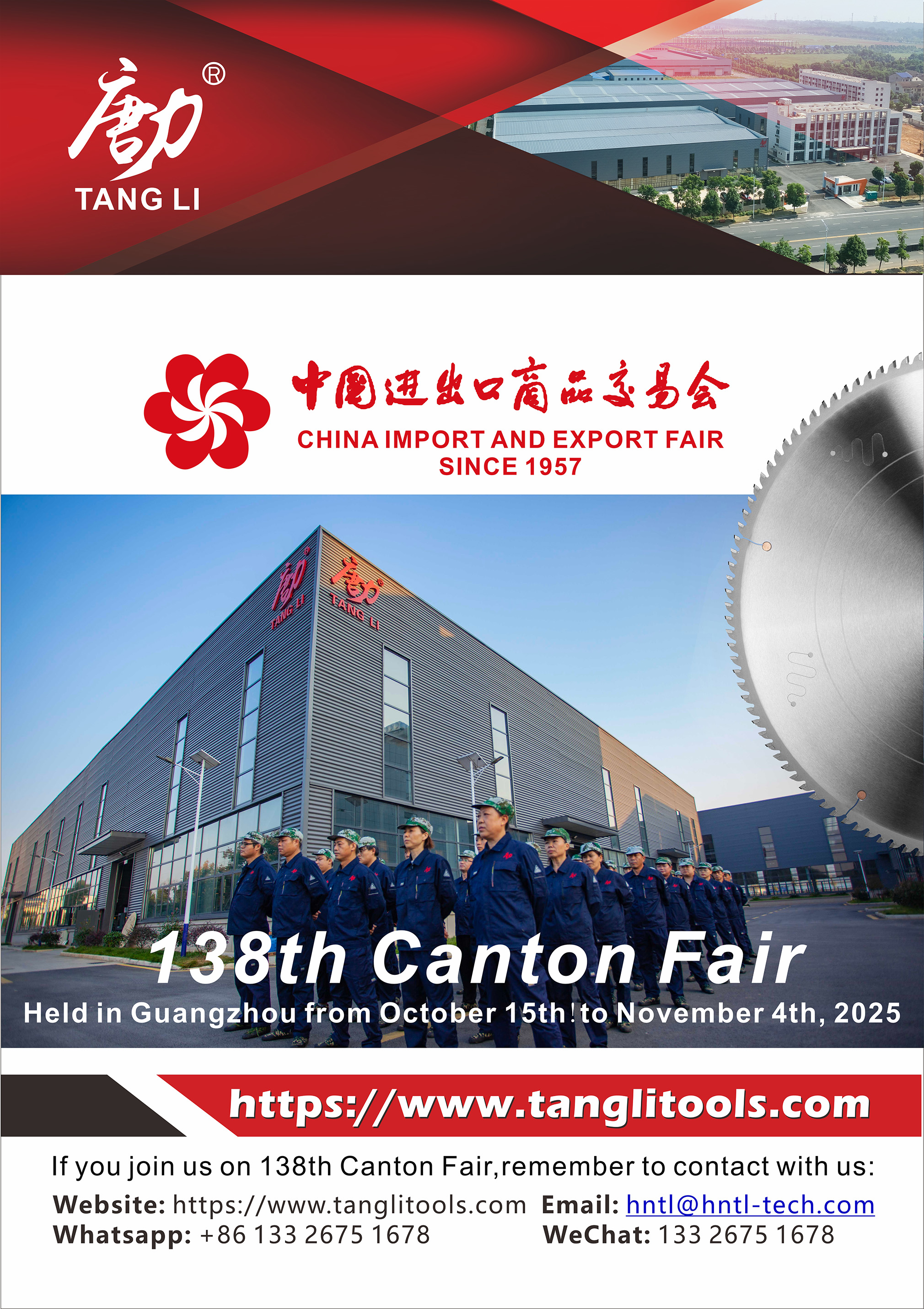 Únase a nosotros en la 138a Feria de Canton ,del 15 al 19 de octubre, 2025 , donde Tangli Group mostrará nuestras herramientas de corte premium y soluciones innovadoras . Ya sea que esté buscando cuchillas de sierra de alto rendimiento o productos OEM/ODM personalizados , ¡lo tenemos cubierto!
